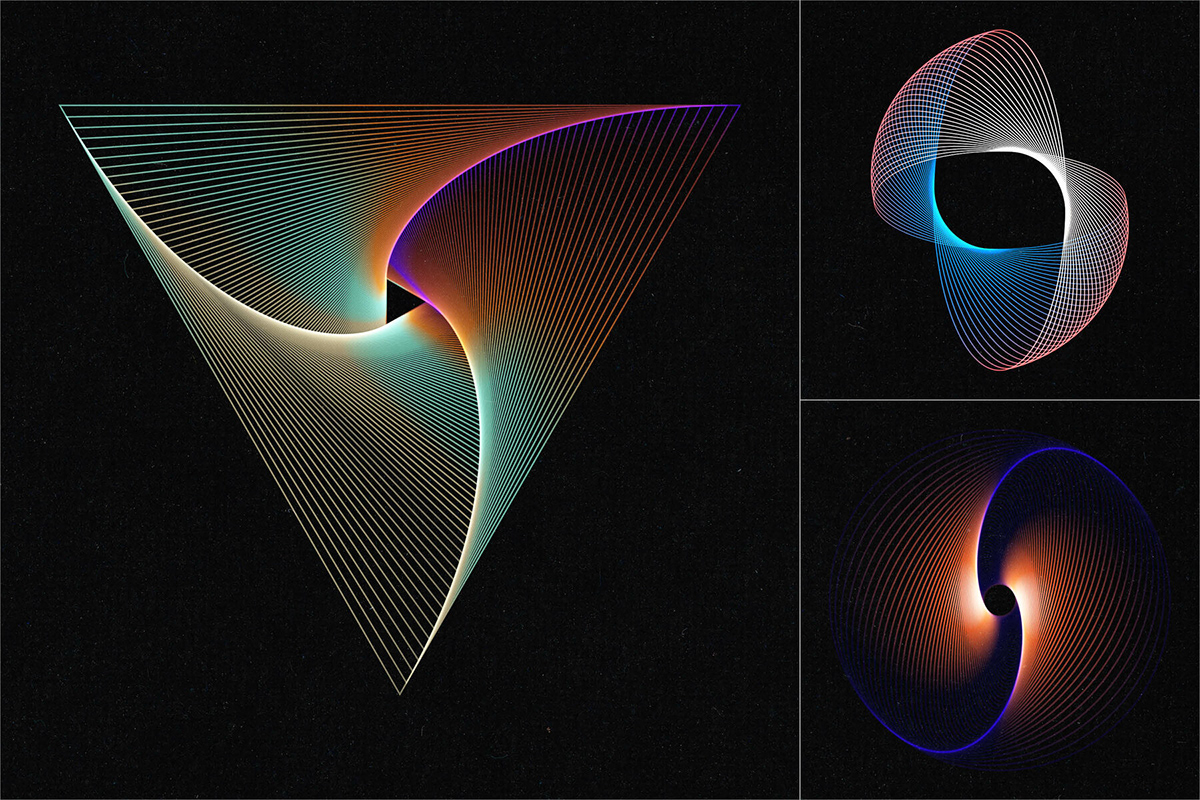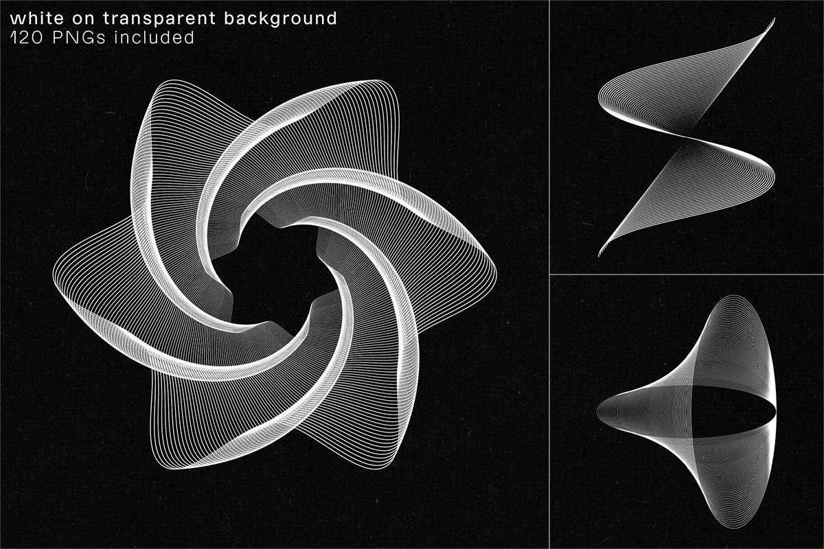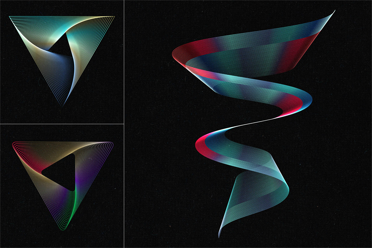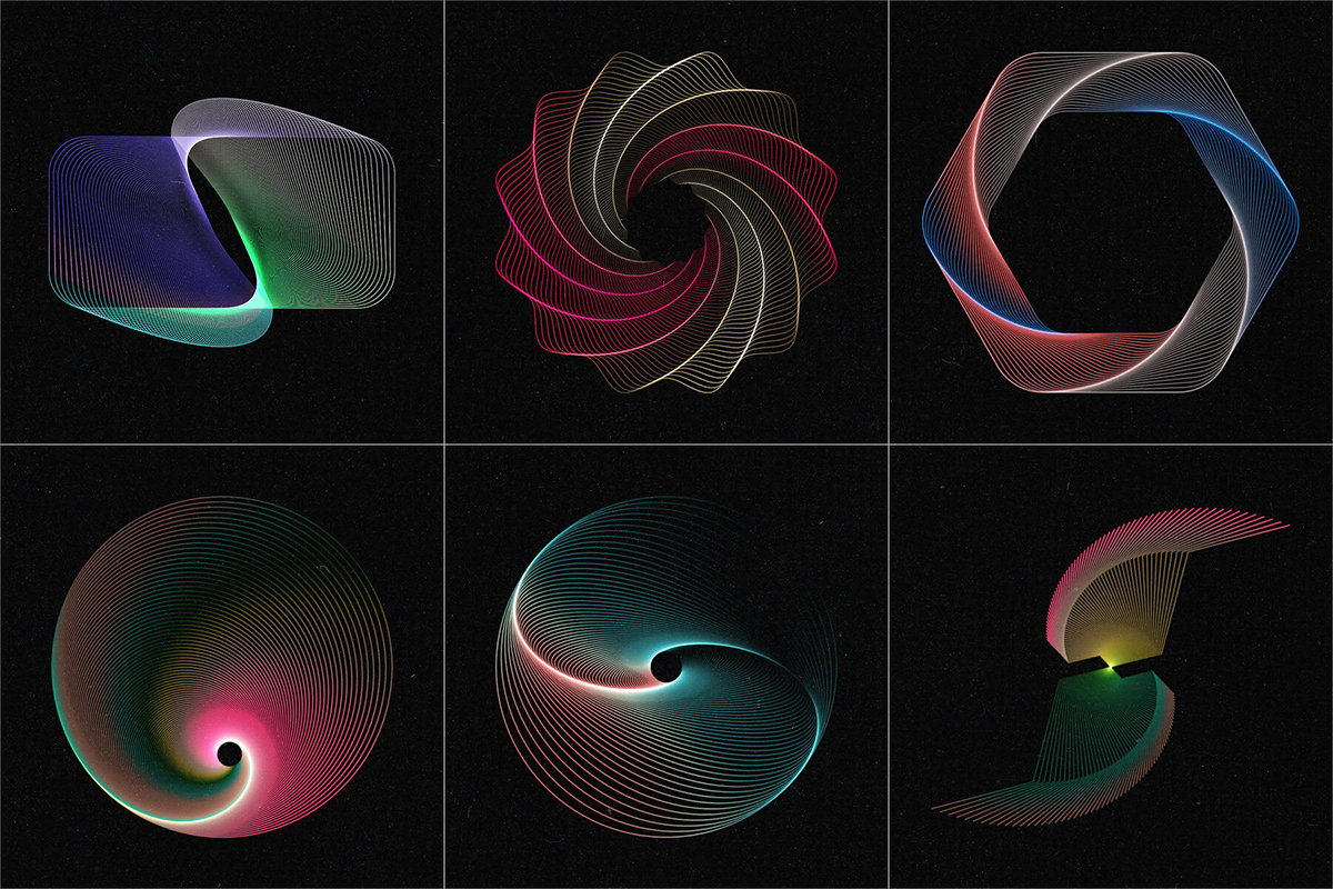 Set of 120 abstract wired design elements with a colourful gradient effect, suitable for your website, app, apparel, packaging, flyers, posters as logo or design element for themes like music, technology, science, communication, math, digital art